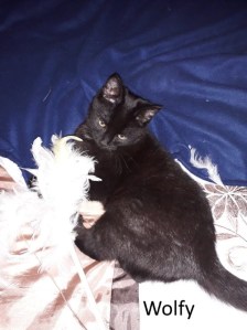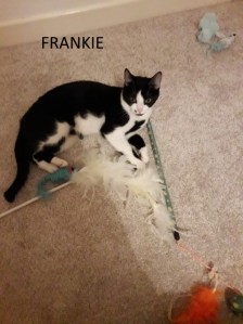 Frankie and Wolverine /Wolfy for short are mother and son. Frankie the mum is 2 years old and Wolfe is 4 months old. They have to be homed together as Wolfe mum is very timid and needs the support of her son to help her to come out of her shell. Frankie is very loving towards her son and adores him Frankie will needs to get to know you before she will let you clap her once she trust you she can be very loving and will let you rub her tummy so she will need someone with patients and a lot time to gain her confidence. Wolfy is a beautiful cuddly boy he is always full of purrs and loves getting petted he loves his toys and like to play and adores his mum.Update Frankie only took five days to come out her shell we think it was just the move and getting neutered that set her back she is now out and running about and paying with Wolfy .