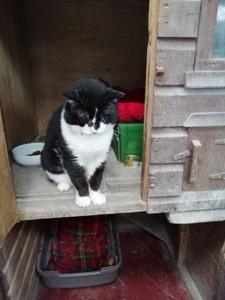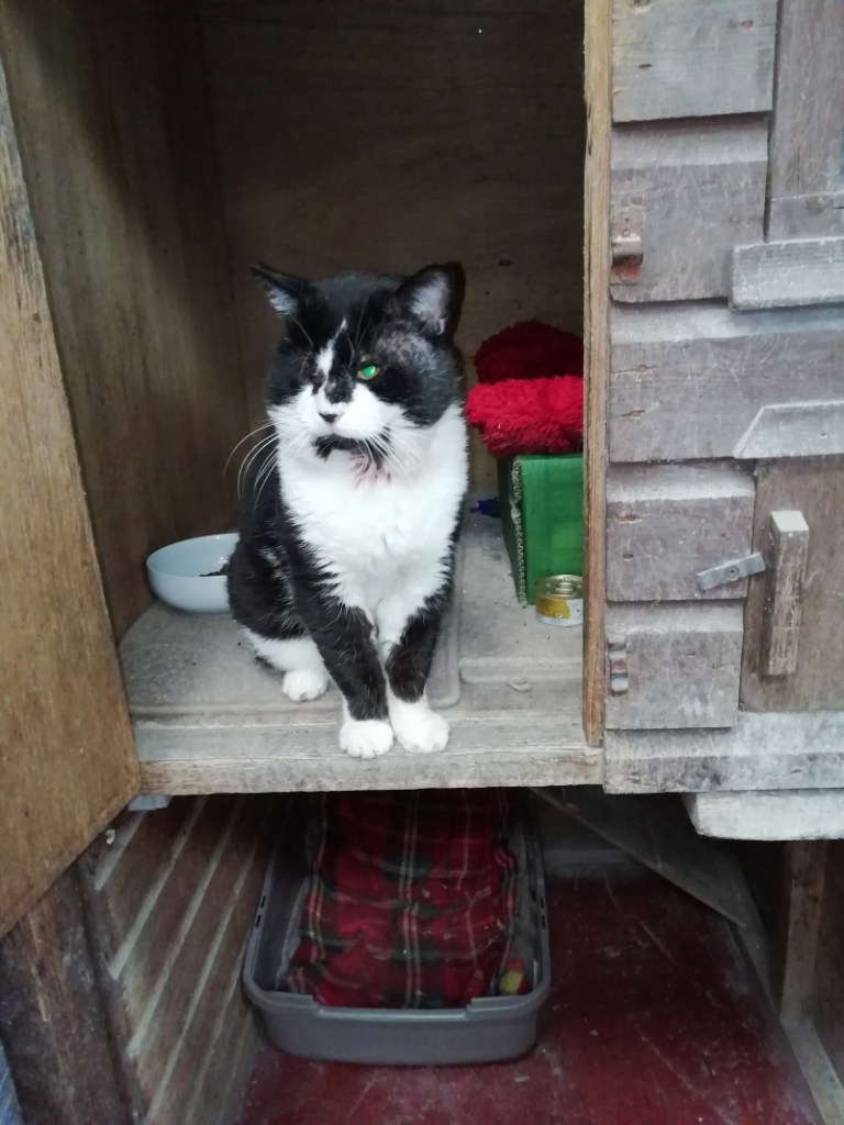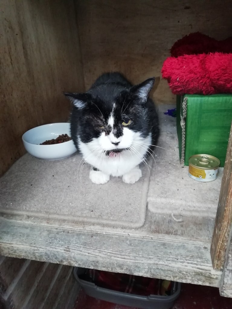 Spider is in his teens and has lived on the streets all his life. Poor Spider is not having a very good time of it just now. He has developed a cyst under his chin and it has grown to the size of an orange. Spider has had the cyst treated by our vets which was a messy job but it has now all been cleaned out. Spider will need a steroid every month as he has an immune deficiency. Whinnybank will cover the cost for this treatment. Spider is a big boy weighing in at 6 Kg so you would soon know he was sitting on your knee. Spider is very depressed at the moment and it would be nice to see him get some T.L.C. to bring him on. We would like Spider to be a house cat and get all the love and comforts he deserves. Spider would be best to be the only cat and no young children. If you would like to offer Spider a loving home please call Sue on 01337 840414. All checks will be done. SPIDER IS NOW BOOKED AWAITING TO GO TO HIS NEW HOME