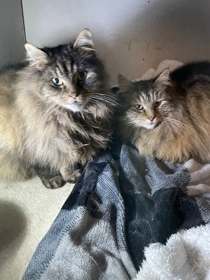 Sadly Wolfy and Ringo’s owner passed away at a very young age and we were asked to find a loving home for the pair. Wolfy and Ringo are five years old. Wolfy and Ringo are very affectionate towards each other so they must stay together. Poor Ringo was very attached to his owner and is finding it very hard at the Sanctuary as he is missing his owner. Because Wolfy and Ringo have been around their female owner all the time they are a bit wary of men but nothing like a bit of chicken will bring them round. Both Wolfy and Ringo will need to be brushed to keep their fur mat free and both are used to that. Ringo might take a bit of time to come round in his new home due to the closeness to his owner. Both Wolfy and Ringo are used to children. If you would like to give Wolfy and Ringo a loving home please call Sue on 01337 840414 or Linda on 01382 330457. All checks will be done. Wolfy and Ringo are now homed.