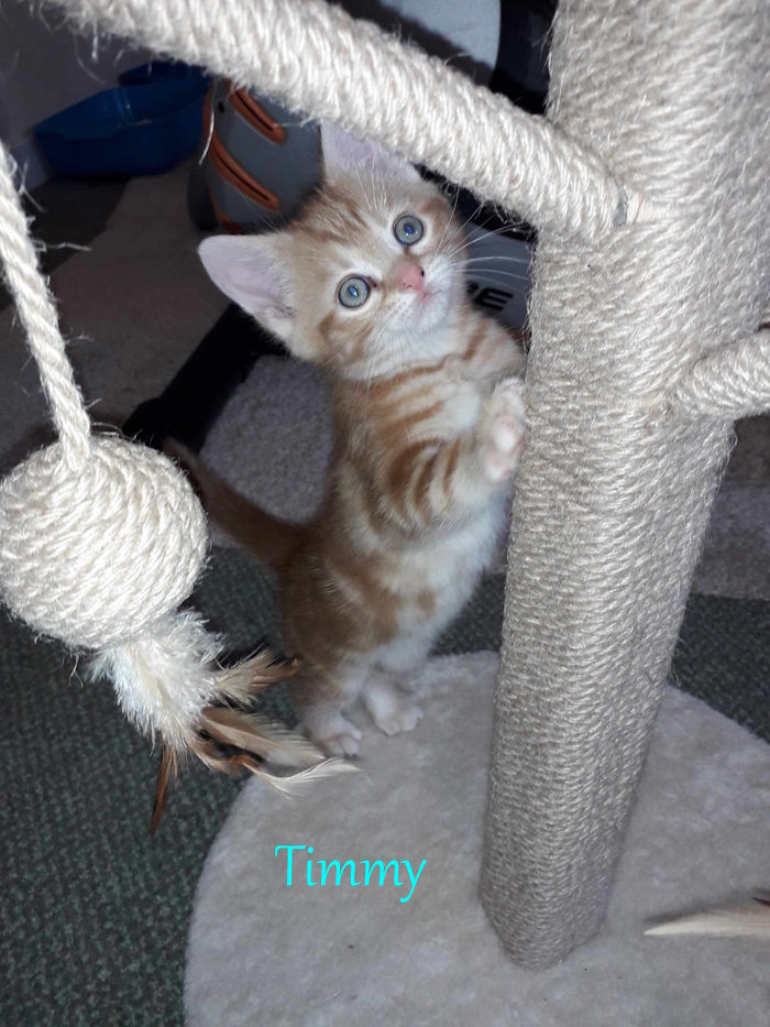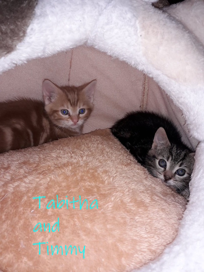Timmy and Tabitha are brother and sister and are about 6 weeks old. They both came in as very timed kittens( almost feral) so Carol our fosterer is taming them up. They must go together as when separated they cry for each other. So we are looking for someone who has had experience in dealing feral kittens as when they move to their new home they will revert back for a couple of days. Carol will be working with them for a few days yet and they are coming along nicely. Sorry no young children. If you would like to take on these two lovely kittens, please phone Linda on 01382 330457. All checks will be done. NOW HOMED